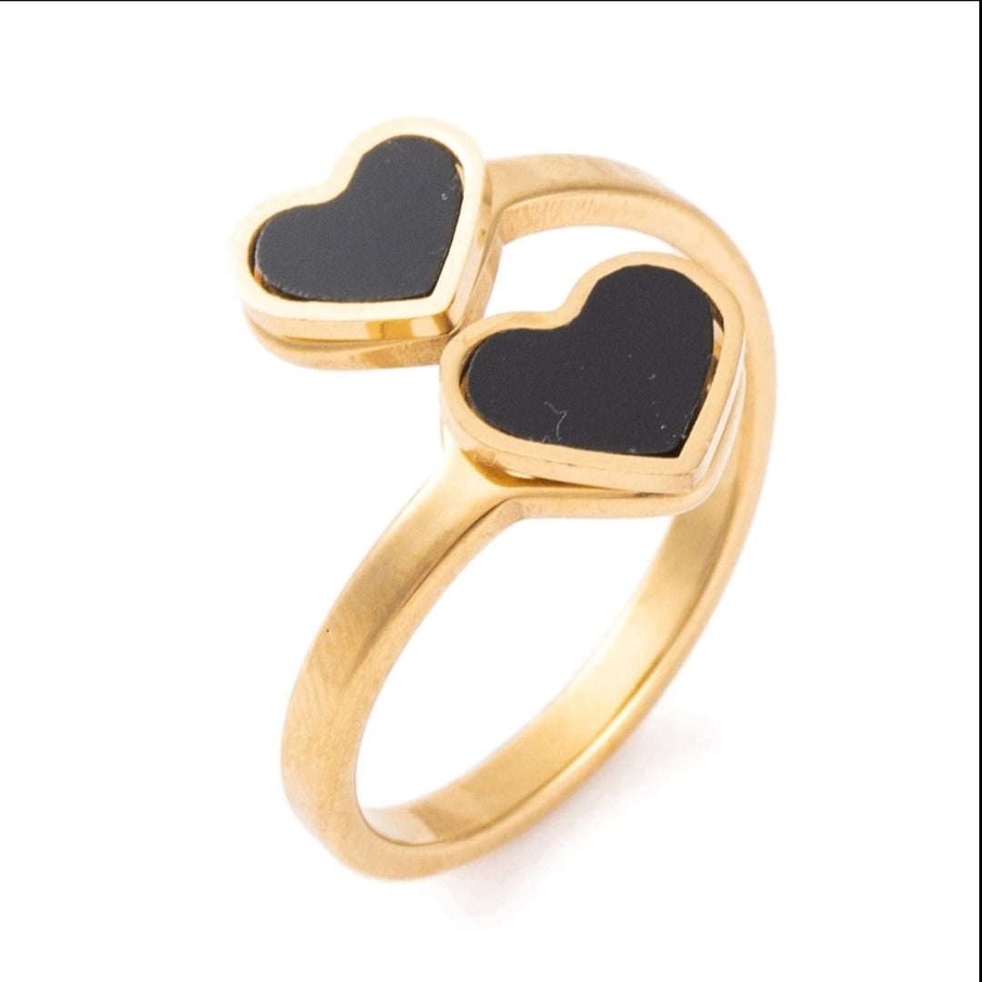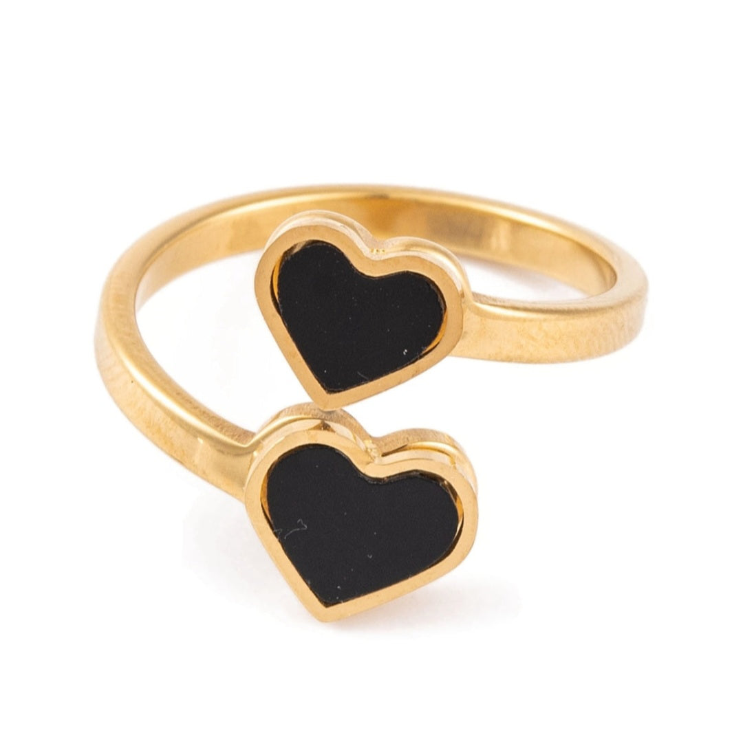 Unleash your passion for style with the Eliara Ring. Made of sleek stainless steel, this versatile ring features two black hearts for a touch of elegance. Perfect for any occasion, it's a beautiful addition to any outfit. Elevate your look and express your individuality with the Eliara Ring.