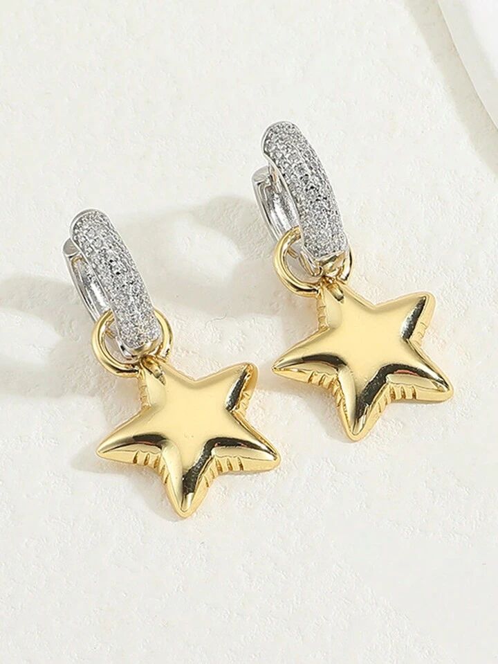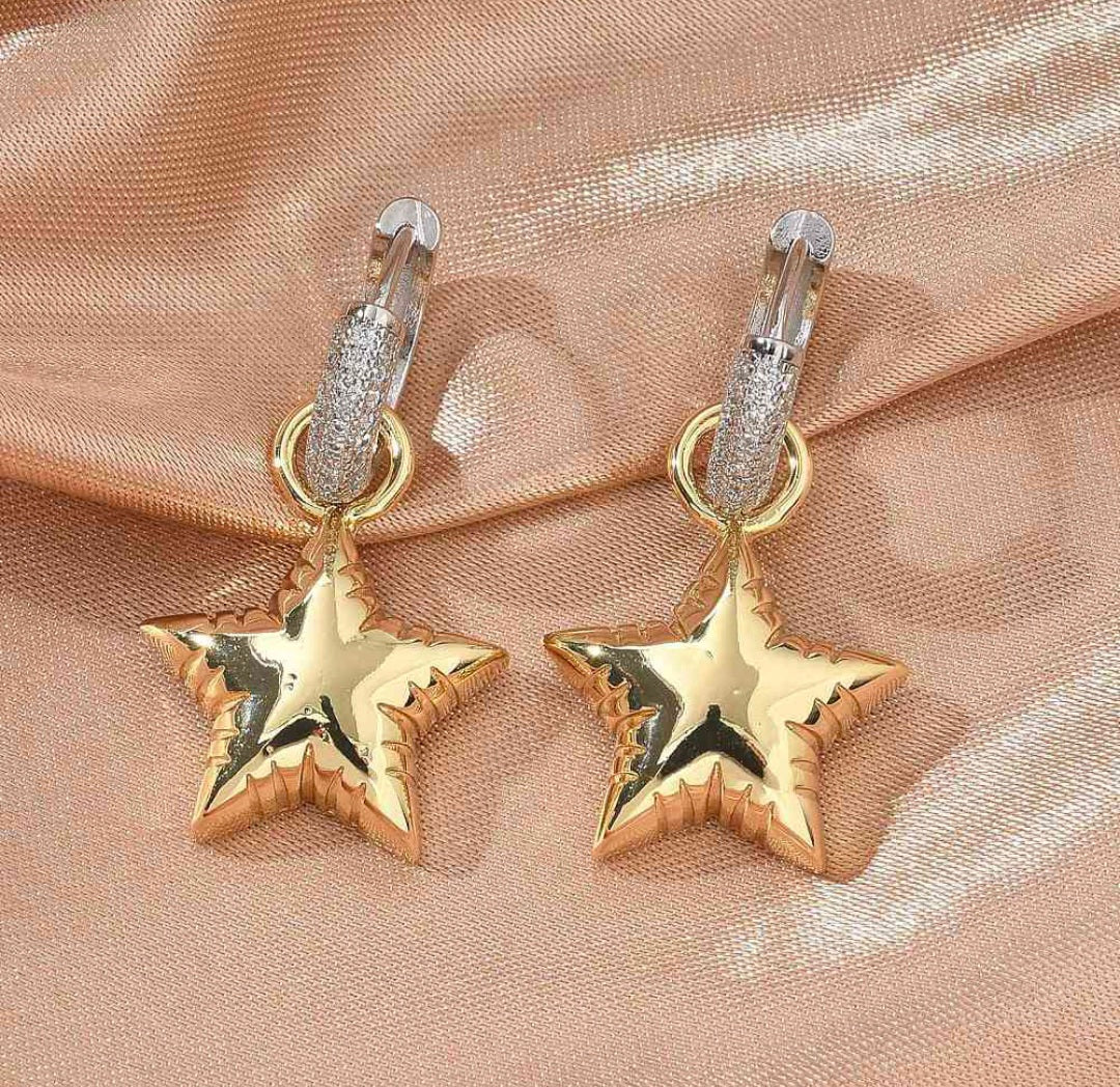 Elevate your style with our Glam Star Earrings! Crafted with 18k Gold Plated material, these stunning earrings feature sparkling zirconia stars in a two tone silver and gold design. Add a touch of glamour to any outfit and shine like a star with these must-have earrings.